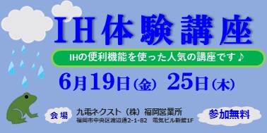 - IHの便利機能を使った人気の簡単IH体験講座<5月・6月>の日程のご案内です。 ガスコンロをお使いの方大歓迎!お申込みはお早めに!ご参加お待ちしております。